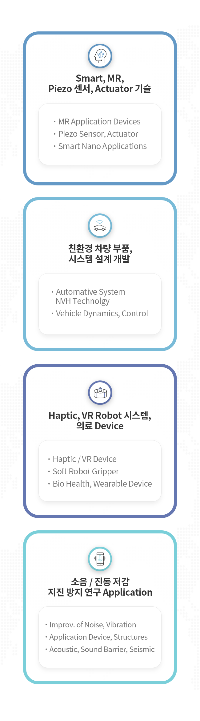 R&D 및 스마트 재료 응용 기술, 차량, 의료장비 부품 및 소음/진동 분야 기술 선도